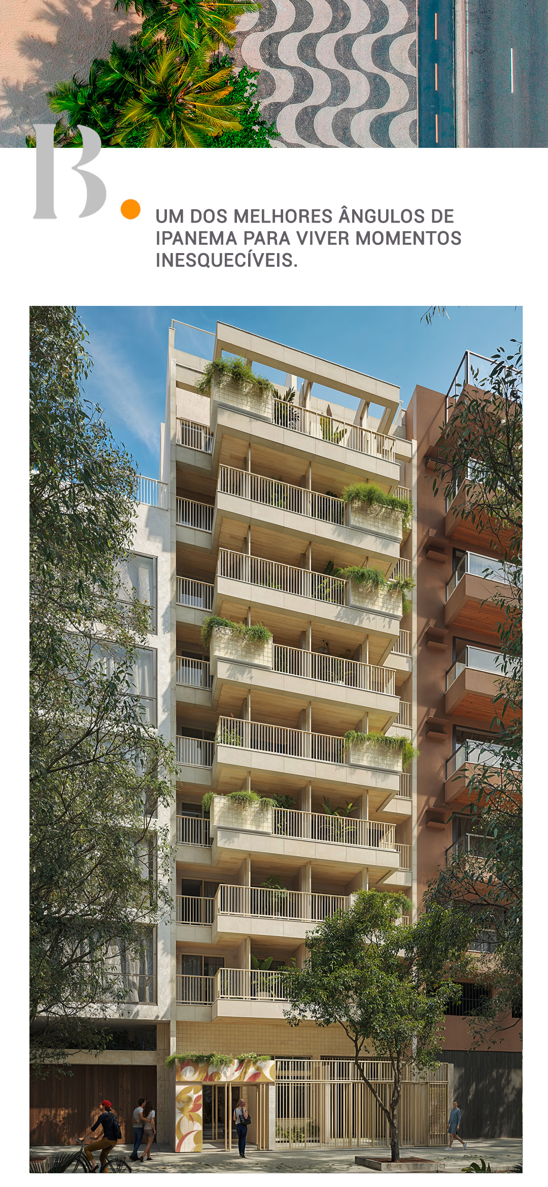 1. Todas as perspectivas, plantas, fotos e imagens contidas neste material publicitário são meramente ilustrativas, seus elementos de composição podem sofrer alterações de cor, forma, textura e tamanho. 2. As unidades privativas e áreas comuns do projeto serão entregues obedecendo ao projeto executivo e conforme as especificações constantes do Memorial Descritivo, que prevalecerá em caso de conflito com qualquer outro material ou informação relativa ao empreendimento, e este poderá sofrer alteração sem aviso prévio em função de posturas municipais, legais e concessionárias. 3. No interesse do bom andamento da obra, a construtora poderá substituir quaisquer especificações de material descritas neste Memorial Descritivo por similar de mesma qualidade, sempre que encontrar dificuldades em sua aquisição, a fim de evitar atraso em seu cronograma. As padronagens serão definidas de modo a obter-se harmonia e bom gosto na concretização final da unidade. 4. A infraestrutura do sistema de ar-condicionado tipo split ou multi-split compreende o dreno do evaporadora, a tubulação de cobre com isolamento térmico, os cabos de força com comando e o ponto de força no quadro elétrico. Ao proprietário caberá a compra dos equipamentos internos e externos, bem como a integração dos mesmos à infraestrutura fornecida. 5. A decoração, iluminação, equipamentos e mobiliário das unidades privativas são apenas sugestões, não fazendo parte integrante da unidade. 6. Os equipamentos, mobiliários e elementos decorativos (quadros, tapetes, livros, almofadas, cortinas) constantes do presente material são referenciais, podendo sofrer revisão de modelos, especificações e quantidades, sem aviso prévio, não sendo entregues os utensílios, adornos e acessórios eventualmente previstos nas imagens. A incorporadora não se responsabiliza por elementos decorativos representados nas ilustrações artísticas. 7. O empreendimento será entregue com a vegetação implantada por meio de mudas, conforme especificação do projeto paisagístico. As imagens apresentadas nos desenhos, artes, perspectivas, anúncios, ou qualquer outra forma de veiculação, representam artisticamente a fase adulta das espécies, que será atingida ao longo do tempo. 8. As imagens, ilustrações, plantas humanizadas referentes ao empreendimento apresentados no stand de vendas, folder, material publicitário, outdoors, anúncios, ou qualquer outra forma de veiculação, são meramente ilustrativos, podendo apresentar variações em relação à obra final em função do desenvolvimento dos projetos executivos, da necessidade de adequações técnicas ou do atendimento a postulados legais. 9. As vistas apresentadas nas imagens são meramente ilustrativas, podendo não retratar a realidade do local do empreendimento. 10. As unidades serão entregues com esquadrias entre os ambientes abertos e fechados, conforme projeto aprovado na Prefeitura Municipal e Corpo de Bombeiros. 11. Não serão admitidas modificações nas unidades ao longo do andamento das obras, exceto as eventualmente oferecidas pela incorporadora. 12. A configuração e os níveis da implantação do empreendimento estão sujeitos a alterações decorrentes de exigências técnicas e estruturais, ao atendimento das posturas municipais, concessionárias e condições do entorno. 13. As imagens de áreas privativas podem possuir configurações diferentes do padrão do empreendimento, no que diz respeito à opção de planta e acabamentos, rebaixos, sancas decorativas, mobiliários e artigos decorativos, não sendo parte integrante do contrato. Para informações sobre o padrão do apartamento, consultar o Memorial Descritivo. 14. As áreas de lazer, vias, vagas e circulação do empreendimento estão sujeitas a alterações decorrentes das exigências das posturas municipais, concessionárias e condições do local. 15. Eventualmente, para atendimento de necessidades técnicas, poderão ser executados shafts e/ou enchimentos, bem como poderão ser alteradas as posições de peças sanitárias. 16. A incorporadora não se responsabiliza pelas construções vizinhas ao empreendimento. Itens como acréscimo nas edificações existentes no entorno, aberturas de janelas, alterações de afastamentos, entre outras condições dos imóveis de terceiros, podem ser verificados no local, cabendo ao Poder Público fiscalizar a regularidade das construções vizinhas ao empreendimento. 17. As informações contidas em todo material publicitário veiculado são meramente ilustrativas, não se configurando como parte de qualquer instrumento legal, podendo, inclusive, ser alteradas sem aviso prévio. 18. As unidades 502 a 902 e 505 a 905 poderão ser adaptadas para acessibilidade conforme a Lei nº 13.146, de 6 de julho de 2015, que instituiu a Lei Brasileira de Inclusão da Pessoa com Deficiência - Estatuto da Pessoa com Deficiência. O cliente precisa solicitar a adaptação até o início das obras. 19. PRPA: Bianca de Souza Bruno - CAU A62283-4 | PREO: Manuel Fiaschi - CAU A29668-6. A incorporação imobiliária do empreendimento foi registrada em 16/06/2025 sob o R-04 da matrícula no 135.092 do 5º Ofício de Registro de Imóveis da Capital do Estado do Rio de Janeiro.